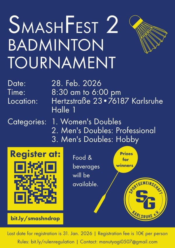 Wir freuen uns, Dich und Deine Vereinsmitglieder zu einem Badminton-Freundschaftsturnier nach Karlsruhe einladen zu können. Diese Veranstaltung wird ein unterhaltsames Turnier für Badminton-Enthusiasten aller Spielstärken in der Region sein und bietet eine großartige Gelegenheit, Kontakte zu knüpfen, viele Freundschaftsspiele zu genießen und mit anderen Badmintonspielern aus der Region in Kontakt zu treten.