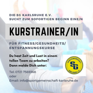 Du bist mindestens 18 Jahre alt, hast Interesse an Sport und Freude am Umgang mit Menschen? Du möchtest neue Erfahrungen sammeln, dann schaue bei uns vorbei und bewirb Dich unter info@sg-ka.de. Ob Nebenjob in Übungsleiter oder Minijobanstellung: lass uns über deine Optionen bei der SGK sprechen!