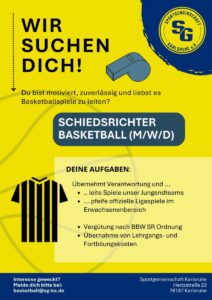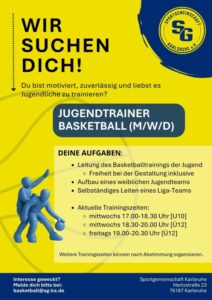 Du bist mindestens 18 Jahre jung, hast Interesse an Sport und Freude am Umgang mit Kindern und Jugendlichen? Du möchtest neue Erfahrungen sammeln, dann schaue bei uns vorbei und bewirb Dich unter info@sg-ka.de. Solltest du noch keine 18 Jahre alt sein, schreibe uns über info@sg-ka.de an.